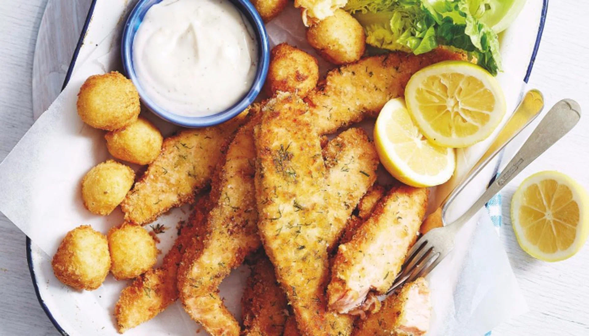 Crumbed with panko and flavoured with dill and lemon zest, these salmon fish fingers will be a family favourite. Serve with delish crumbed mashed potato balls