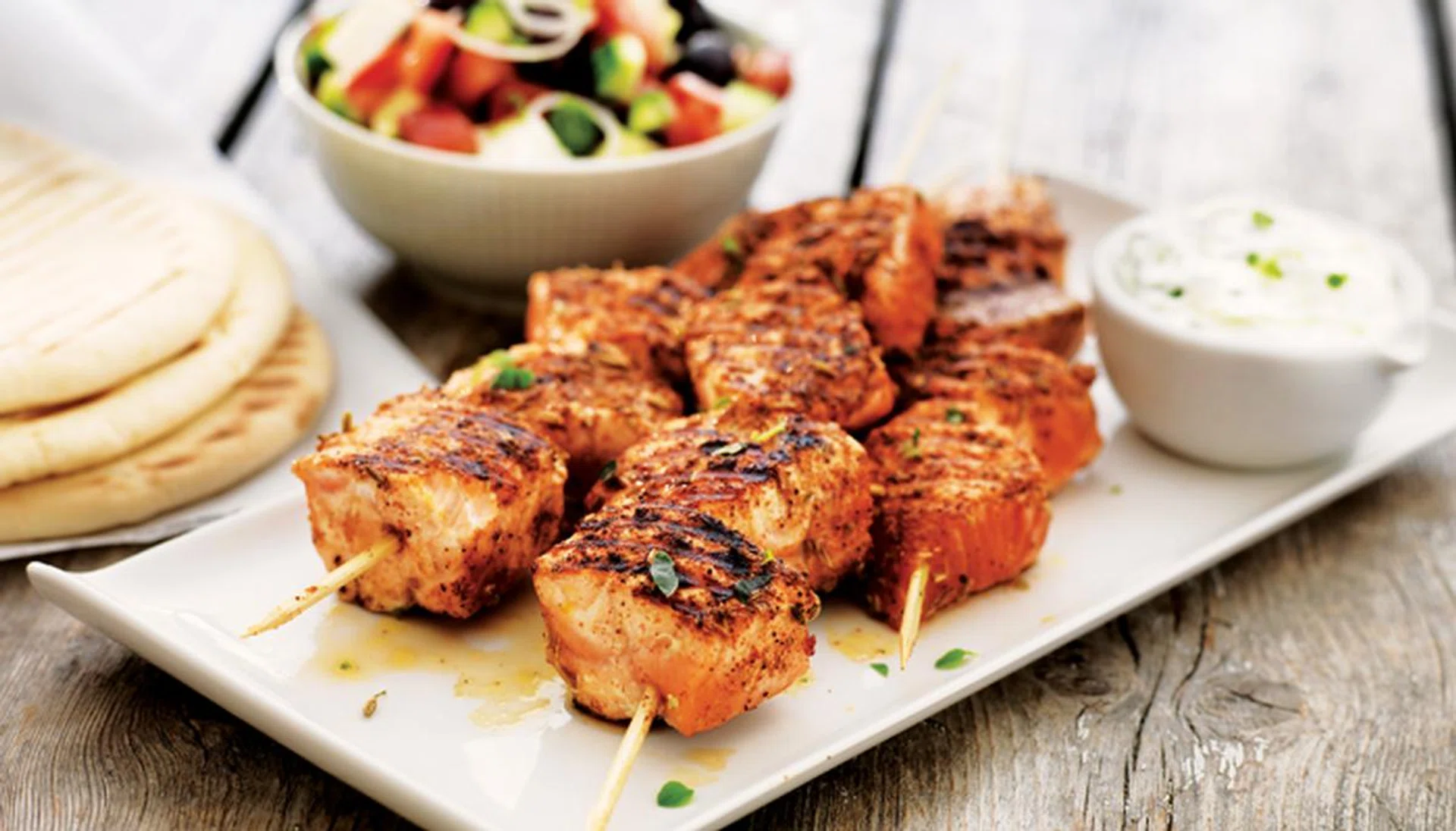 Elevate your Salmon Skewers by marinating with spices and serving with a homemade cucumber yoghurt dip and Greek salad on the side.