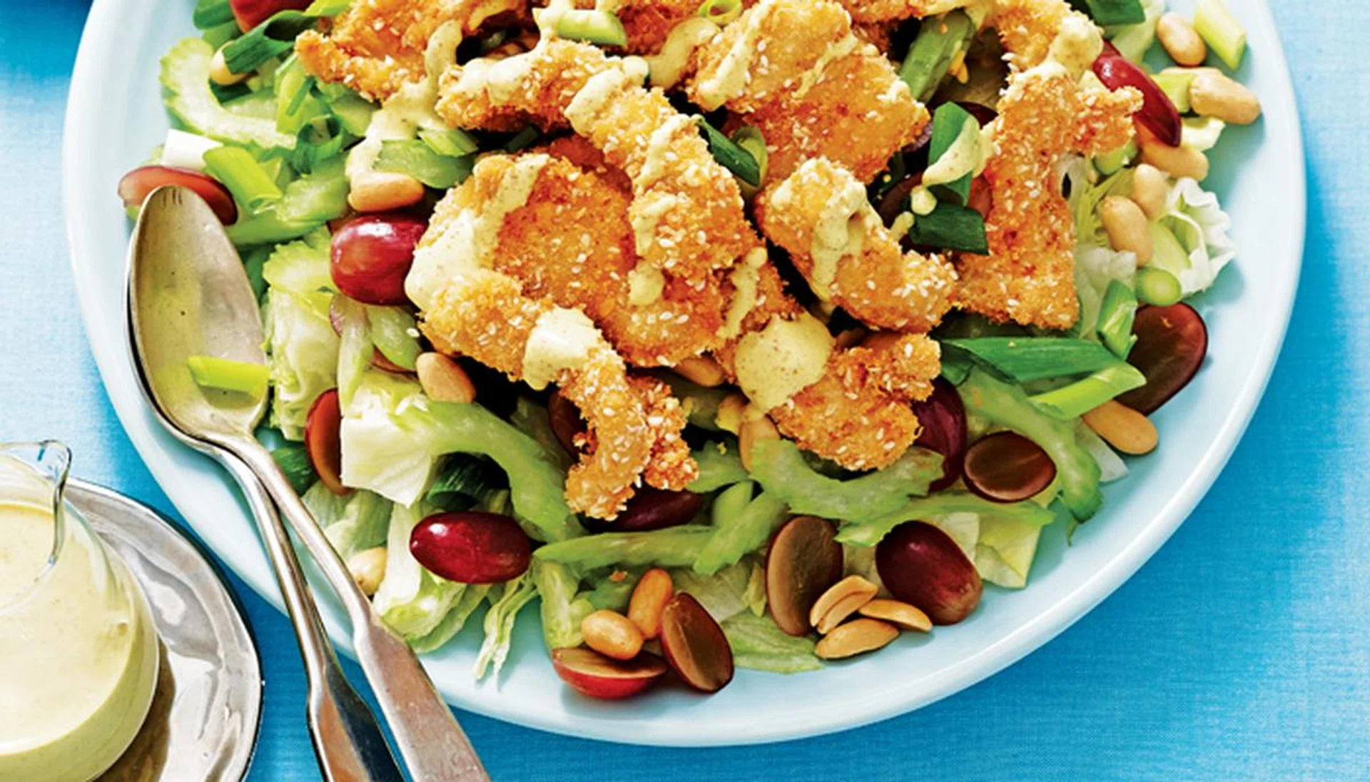 Tender, crumbed chicken breast on top of a diverse textural fruit and vegetable salad completed with a to-die-for dressing.