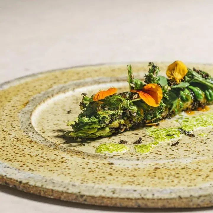 Chef-owner Michael Wilson celebrates spring in this pretty spot in Gardens by the Bay. The meal starts with snacks like Kingfish and Caviar (algae tart shell, aged kingfish, smoked cream, Amur caviar) and Apricot and Comte 36 ( apricot ‘leather’, 36-month aged comte cheese, gel of sauternes). If you’re brave, a lunch-exclusive dish to tuck into is the Domaine St. Vincent asparagus, rolled in a confit egg yolk emulsion and black ants. The insects, included for acidity, are farmed for culinary use in Massachusetts. On the side: charred kale, wild garlic puree, buttermilk sauce and wild garlic oil. Another highlight is the slow-cooked Iberian suckling pig, served with savoy cabbage puree and chou farci. Finish with a pretty dessert of caramelised homemade brioche soaked in a tonka bean-infused, alongside Tonka bean crème diplomat and crowned with strawberries.