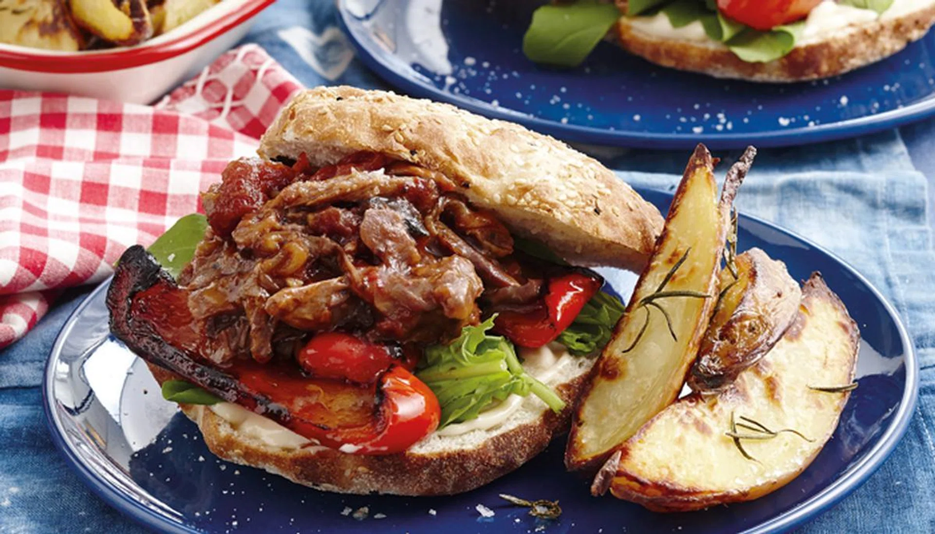 Served with golden rosemary wedges, this burger stars shredded lamb, slow-baked in a flavourful stock, char-grilled capsicums, tahini mayonnaise and rocket.
