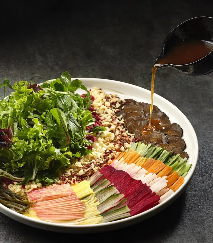 One example will be Exotic Garden with Black Truffle in Osmanthus Sauce. A dish with a story that is as colourful as its looks, this ‘garden’ was made popular as a lo hei must-have over the festive period, and sought-after all year round. Fans are enamoured by the abundance of fresh vegetables accompanied by a medley of truffle oil, black truffle sauce, osmanthus sauce, rice puffs, freeze-dried pineapple as well as cordyceps and black truffle, among others. Then there's the pièce de résistance of homemade crispy soybean crumbs.