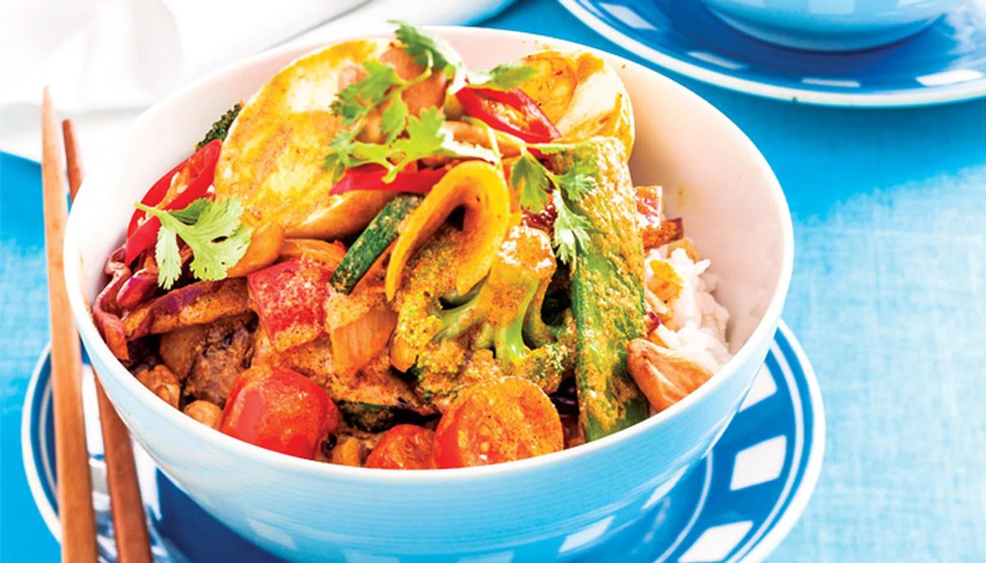 02. Meanwhile, in a wok or large frying pan, heat oil on high. Stir-fry onion 1 to 2 mins until beginning to brown. Add curry paste and stir-fry 1 min until fragrant.