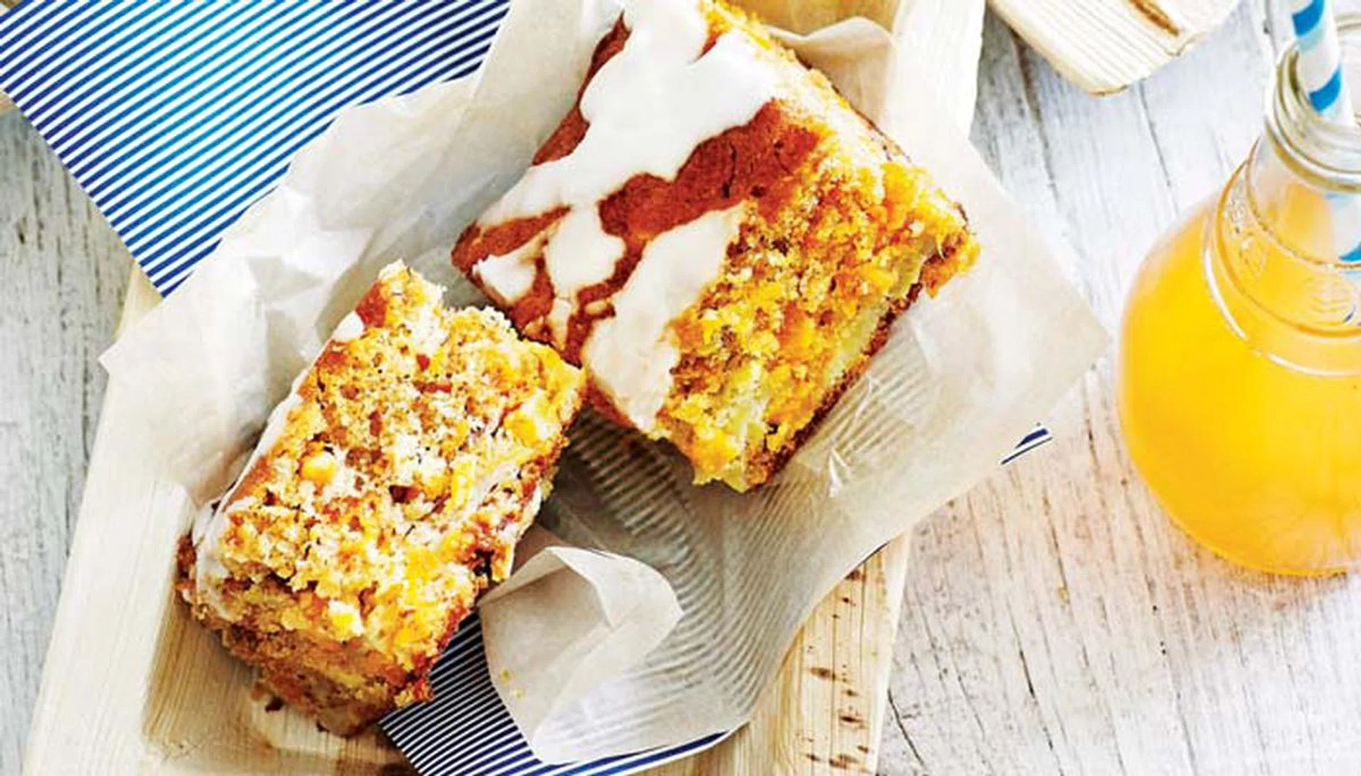 03. Sift over the flour, bicarbonate of soda and spices, and stir to combine. Add the mashed banana, carrot and peach; mix well. Spread the mixture into the prepared pan and bake for 35-40 mins or until the cake is golden brown and firm to the touch. Cool in the pan before turning out onto a wire rack.