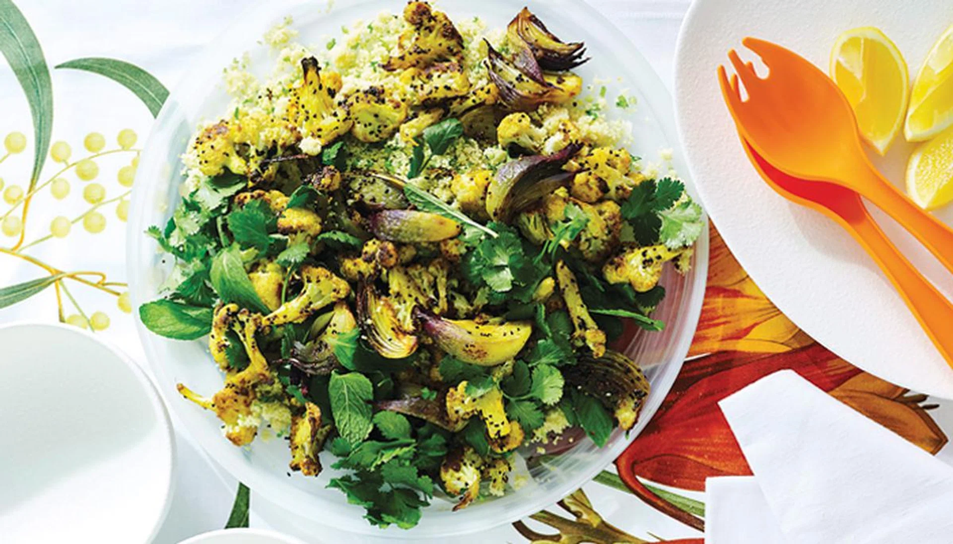 05. In a large bowl, combine the couscous, cauliflower mixture, coriander leaves and stems, mint leaves and lemon juice. Gently toss to combine before transferring to a serving plate.