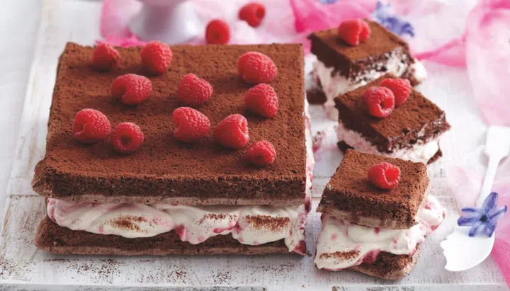 This Double Chocolate and Raspberry Sponge Slice has the softest of sponge sandwiching a white chocolate cream with pops of sweet raspberries.