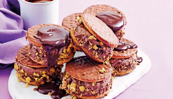An elegant ice-cream dessert heightened by the textural element of buttery, digestive biscuits and chopped-up Crunchie bars. Yum.