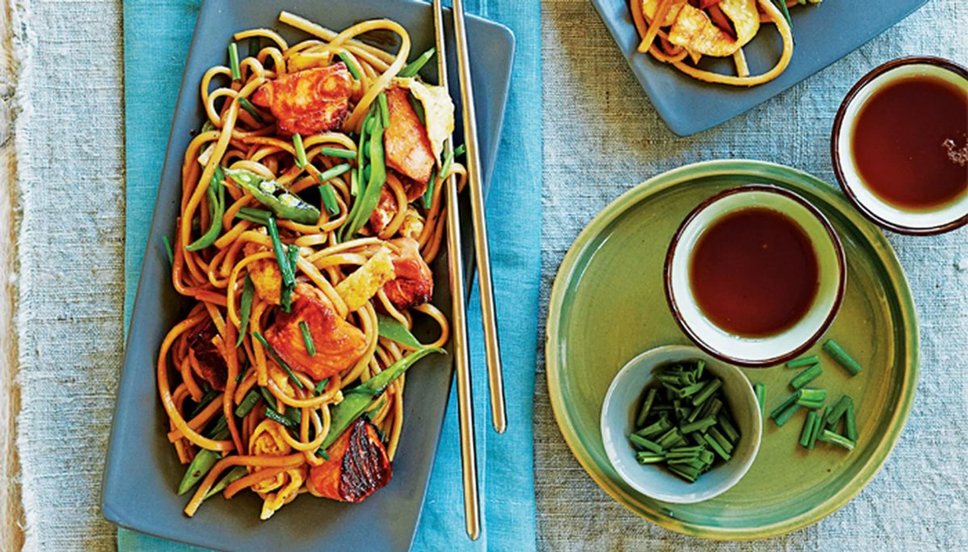 This recipe is perfect for a healthy family dinner. The Teriyaki Salmon Stir-fry is served with noodles and an omelette - all ready in 30 minutes!