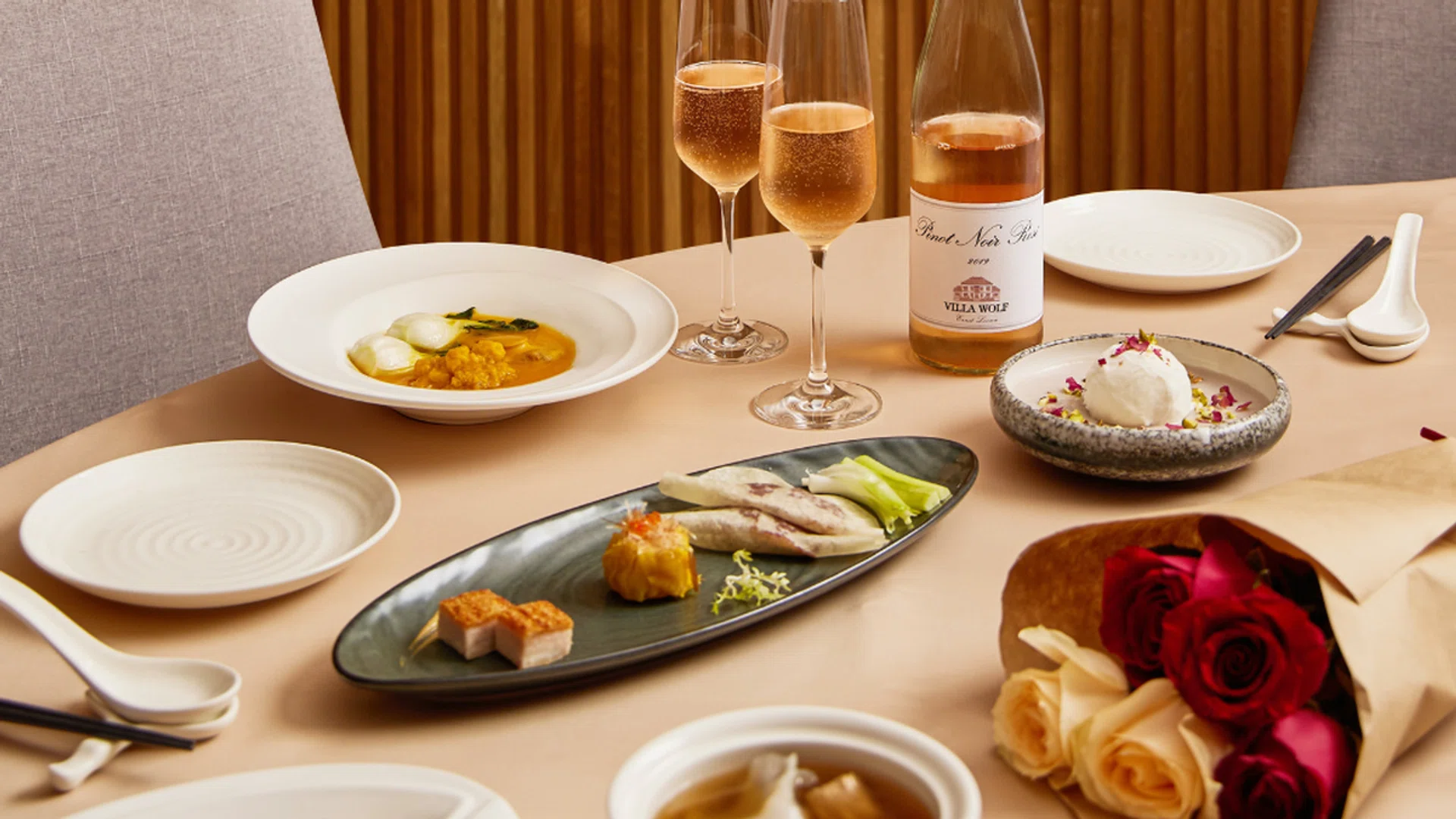 Before you tap out from a food coma, save room for desserts like chilled yam paste with coconut ice cream and pistachio. Adding a little sparkle to your evening, a glass of rosé will be served on the house. Available for lunch and dinner from 6 to 14 February.