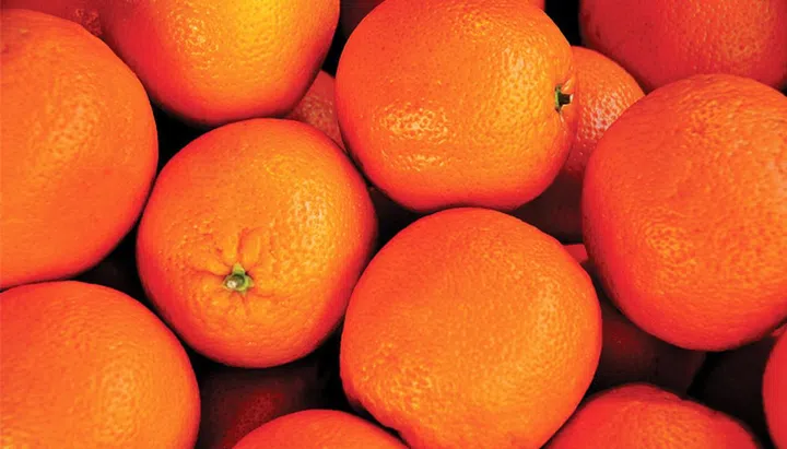 The navel variety is at its best – look for oranges with an indentation like a bellybutton at the base. Choose oranges that have bright skin with a slightly pebbly texture and feel heavy for their size. Navels have sweet and juicy flesh and very few seeds.