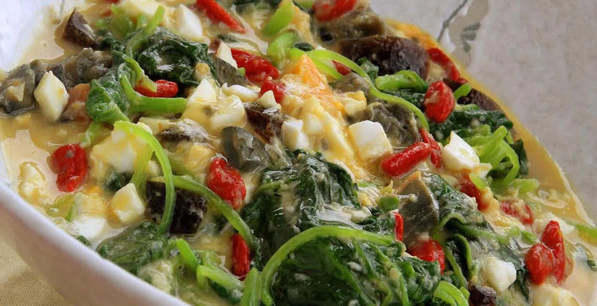 Make this Chinese zi char favourite at home. You simply need spinach, wolfberries, and a delicious mixture of century egg, salted egg and regular egg.