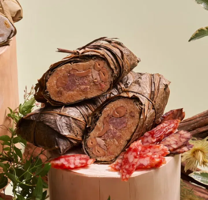 Shang Palace's chef Daniel Cheung takes us on a flavourful trip down memory lane with his Red Fermented Bean Curd Pork Belly and Peanut Rice Dumpling, drawing on childhood memories of umami red fermented bean curd dishes. Within each parcel is tender pork belly, with red fermented bean curd blended into the dumpling, adding layers of flavours and complexity. Peanuts, mung beans, and black-eyed peas, all enveloped in fragrant glutinous rice, lends crunch and texture.