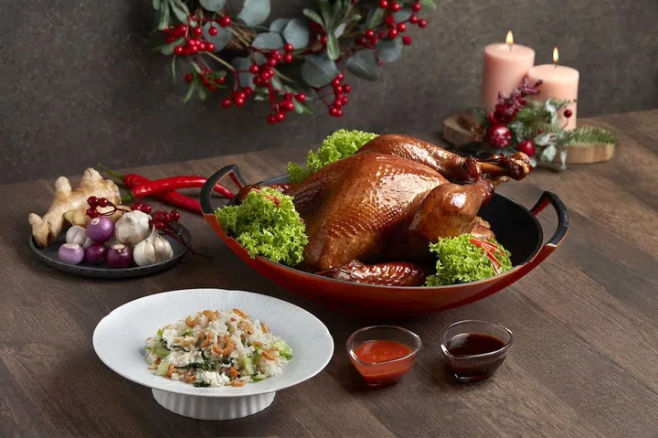 Every year, the culinary team behind The Fullerton Hotel and The Fullerton Bay Hotel releases a turkey inspired by local flavours. Roast Turkey Pongteh ($258 nett for 6-7kg) is this year’s feature, with the turkey marinated, slow-roasted, and then topped with the classic fermented bean gravy. Pumpkin rice garnished with cranberries, housemade sambal belacan, and belinjau crackers round out the meal with a ginger flower, green mango, and pomelo salad.