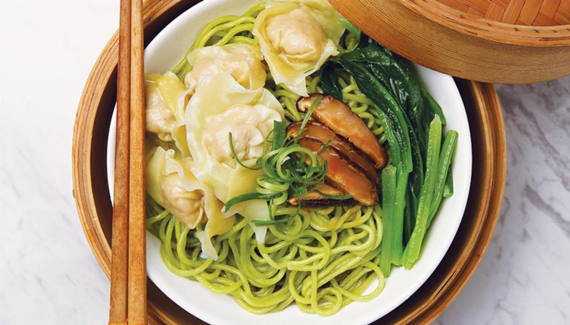 06. Cook fresh spinach noodles in boiling water for 6 mins. Drain well and divide equally among the prepared serving plates. Toss to mix well. Serve with chye sim and wantons.