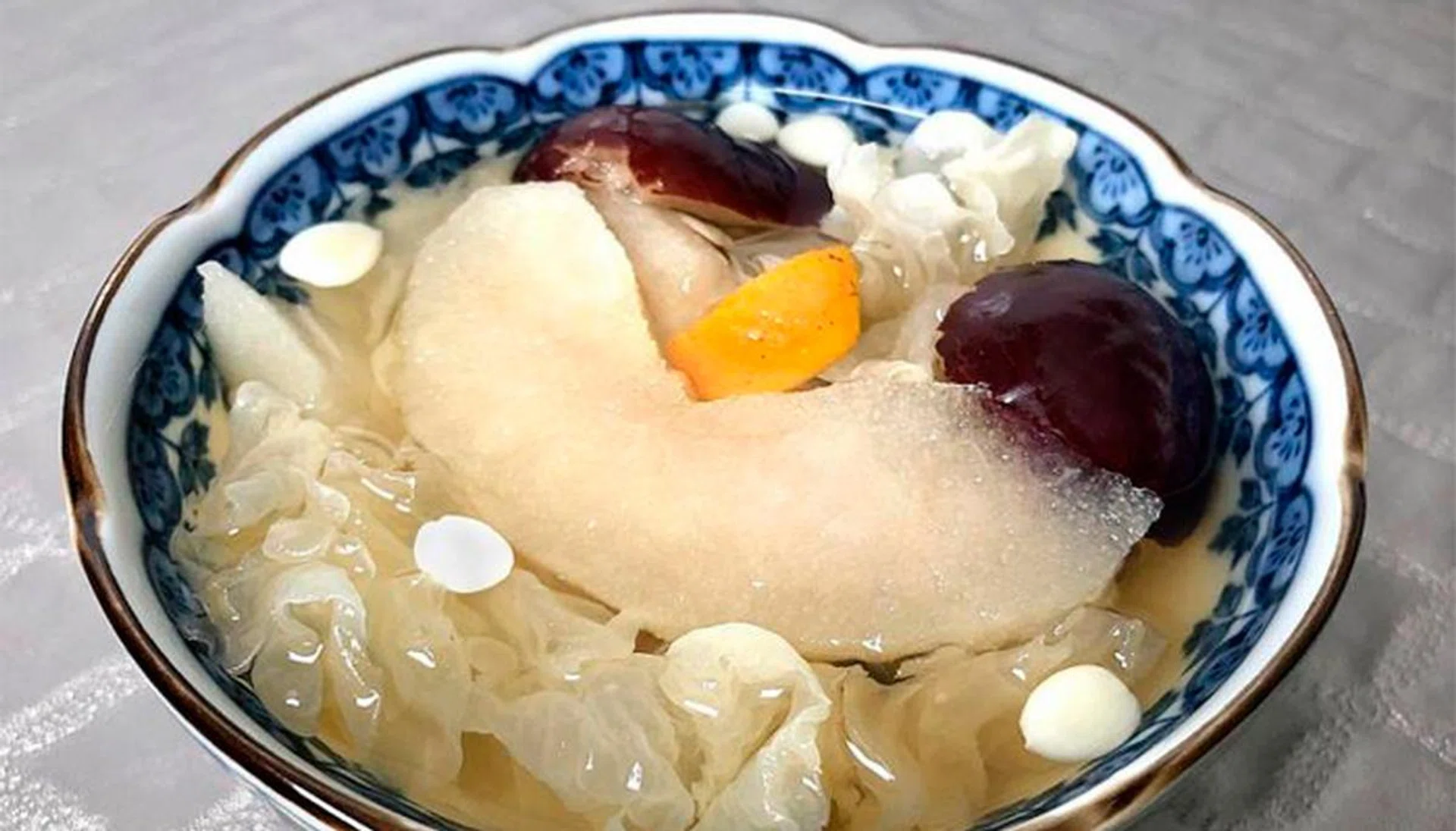 Counter the hot weather with this easy-to-cook Chinese pear and snow fungus soup that contains sweet, cooling ingredients, such as the sugared tangerines, honey date, red dates and fresh pear.