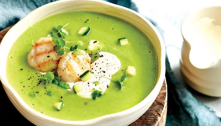 A simple light chowder, this vibrant fennel, zucchini and pea with scallops soup meets your daily requirement for green vegetables!