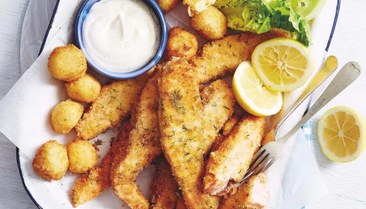 Crumbed with panko and flavoured with dill and lemon zest, these salmon fish fingers will be a family favourite. Serve with delish crumbed mashed potato balls.