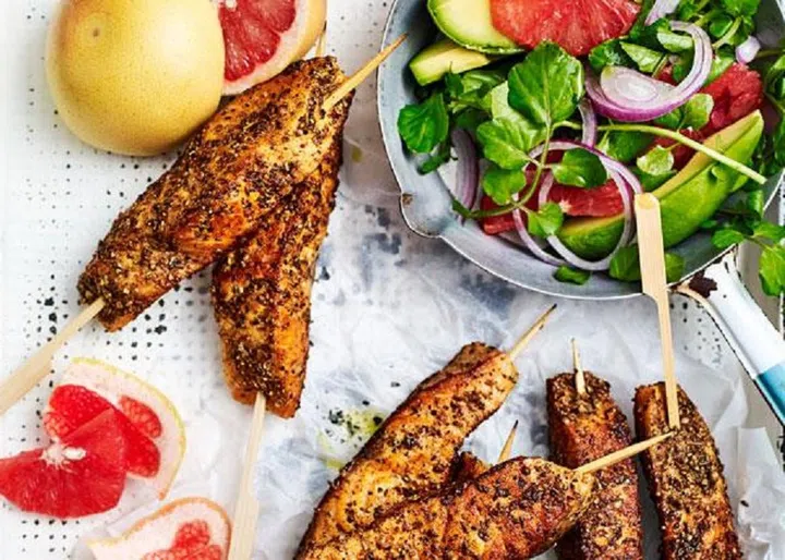The heady aroma of Indian spices from coriander, fennel to turmeric and cardamom will have you hooked on this unique salmon skewer recipe. If they ever get too intense, cleanse your palate with a citrus and avocado salad which comes with the refreshing crunch of watercress, plus sweet-tart grapefruit.