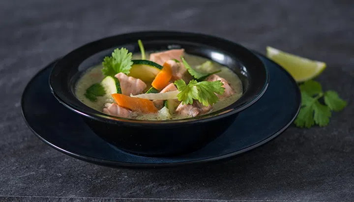 Nothing beats a nice, spicy Thai soup with salmon. Coconut milk, ginger, chilli and coriander – need we say more? Serve this dish, recipe by Norwegian chef and restaurateur Chef Geir Skeie, with steaming hot rice and enjoy!