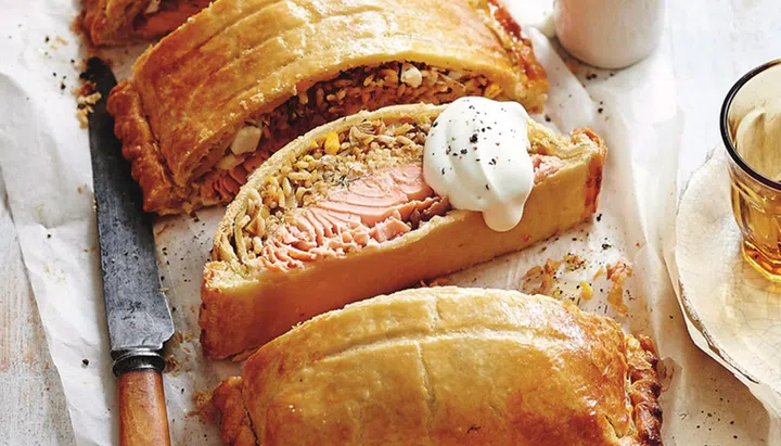 Tender salmon topped with a zest and herb basmati rice mixture, all nicely sealed in a home-made crisp, golden rough puff pastry.