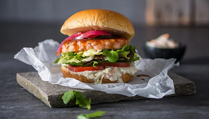 Salmon makes a great burger! Here, Norwegian chef and restaurateur Chef Geir Skeie transforms a fillet of salmon into a juicy burger and added some real American BBQ sauce and a fresh homemade coleslaw to complete the magic. Delicious with baked potatoes and a crispy green salad!