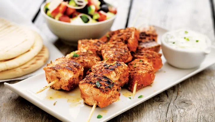 The spices on these Salmon Skewers will go well with a cool yoghurt dressing.