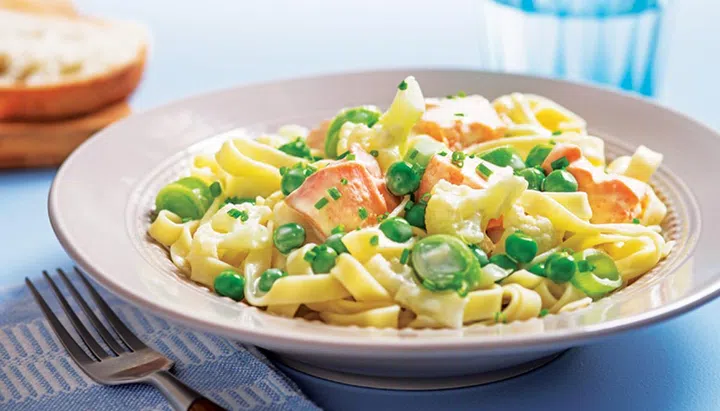 Relish every bite of this creamy salmon pasta with the occasional bite of peas and mouthwatering salmon.