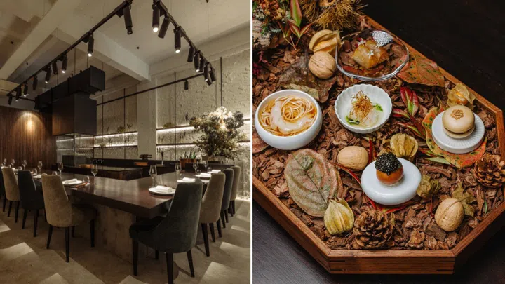 The autumn Hassun (or seasonal platter) is a visual spectacle, showcasing deftly crafted appetisers amidst a dramatic botanical arrangement. There's lemon ponzu-cured hirame, aori ika (reef squid) in a refreshing yuzu vinaigrette, a caviar-topped donut filled with onion creme fraiche and a foie gras monaka that's a delight to eat — its richness balanced with sweet persimmon and airy wafer shells. Chef Helou's signature cold ebi somen laced with prawn oil, his riff on local prawn noodles, also makes an appearance.