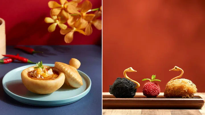 The photogenic Yuan Yang Love Swans with Golden ‘Lychee’ Ball ($10.80++) is another highlight, with a 'black swan' concealing salted egg yolk lava and a mochi filling, while the 'golden swan' is filled with a chicken and mushroom filling.