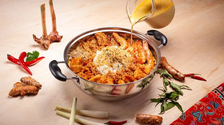 The broth isn't too spicy (great for kids or those who can't stomach spice) and boasts a fragrant coconut-y aroma. But you can also spice things up with the additional sambal that's served on the side. Each set is priced at $68 and can feed five to seven people.