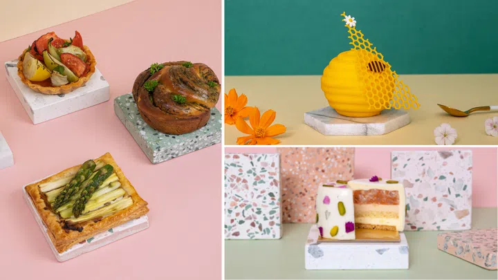 If you're there for sweets, the whimsical terrazzo-inspired Pink Guava and Pear cake ($10) layered with pink guava cream, fresh pear cubes, elderflower liqueur and pear mousse is particularly enjoyable. But if you love a tart dessert, chef Maxine's signature Beehive cake with lemon and honey flavours will please your tastebuds.