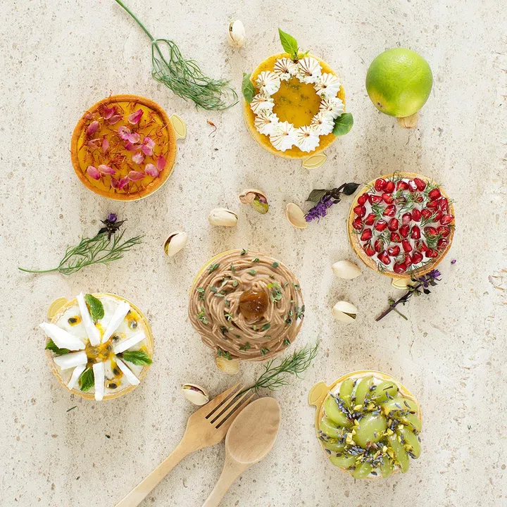 To kick off the opening, she's introduced a menu of six tarts, all of which boast playful flavours and equally quirky names. For instance, there's the Stonehenge with white meringue chips that nod to the monument, atop vanilla custard and dollops of passion fruit. There's also the Grape Kobo (inspired by Hokkaido's Milk Kobo Factory) that has yoghurt and cheese custard, grapes and raw honey perfumed with lavender.