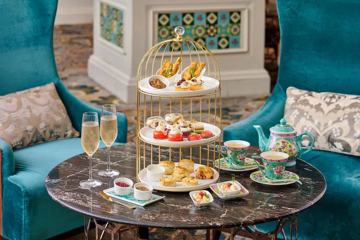 The tea set nods to the hotel's heritage precinct with a clutch of Peranakan-inspired desserts — there's bubur hitam cheesecake topped with coconut chantilly and coconut crunch, a fluffy pandan chiffon sponge layered with gula melaka cremeux, and a bandung creation with raspberry lychee marmalade. From the savoury selection, expect chicken fillet with spicy bean aioli, jumbo lump crabmeat grape jelly with crisp mantou, and an otah and prawn quiche. The quintessential scones get an Asian spin too, made with bak kwa as a nod to the upcoming Lunar New Year.