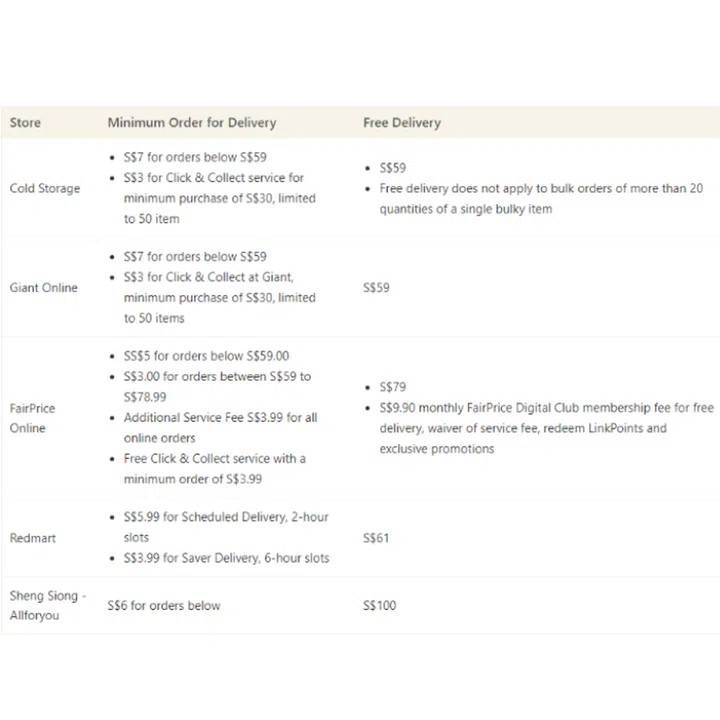 Interestingly FairPrice’s Click & Collect service is free with a minimum order of S$3.99, a very low amount which suggests the supermarket might be more interested in a self-collection model rather than delivery. If you are a fan of FairPrice, don’t fret, you can still shop there with some of the best credit cards that offer extensive rewards and cashback to help you save on your grocery bill. You can also consider joining the FairPrice Digital Club membership at S$9.90 per month where you’ll receive free delivery, a service fee waiver, exclusive promotions, and other benefits. This membership may be worth it if you have high grocery expenses every month.