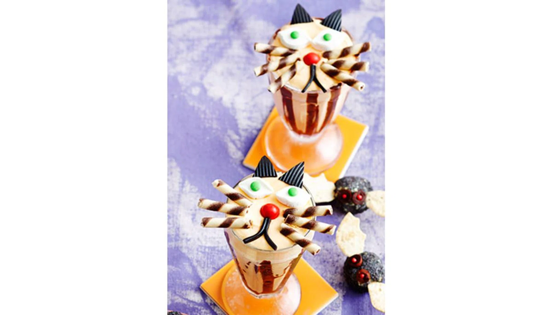 04. For each glass, halve marshmallow and place a green M&M in the centre of each for eyes. Place a Jaffa on top of cream for nose and 3 halved wafers around nose for whiskers. Place licorice triangles on the edge of glass for ears and thin licorice straps for the mouth.