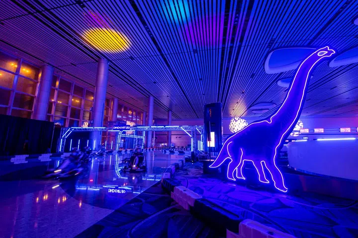 The departure hall at Terminal 4 now features numerous dinosaur-themed activities for adults and children alike.