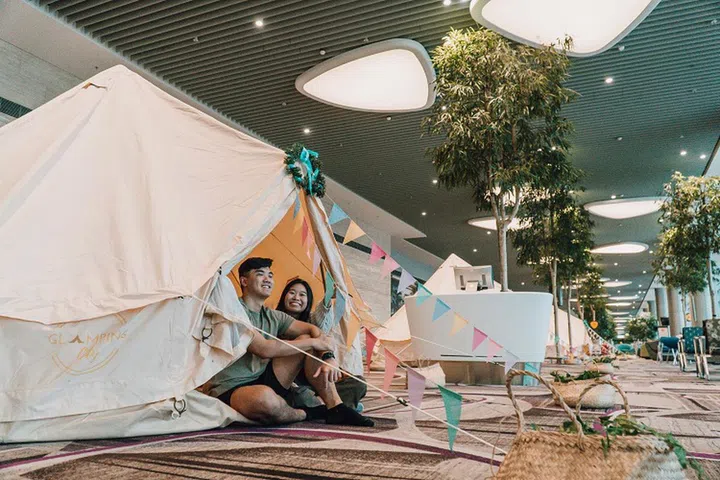 At the novelty "glamping" site in Terminal 4's transit area, guests can look forward to tents furnished with queen-size air beds and access to the in-transit Entertainment Area and Heritage Zone. Movie-on-demand credits and access to Terminal 4's festive activities are also part of the package.