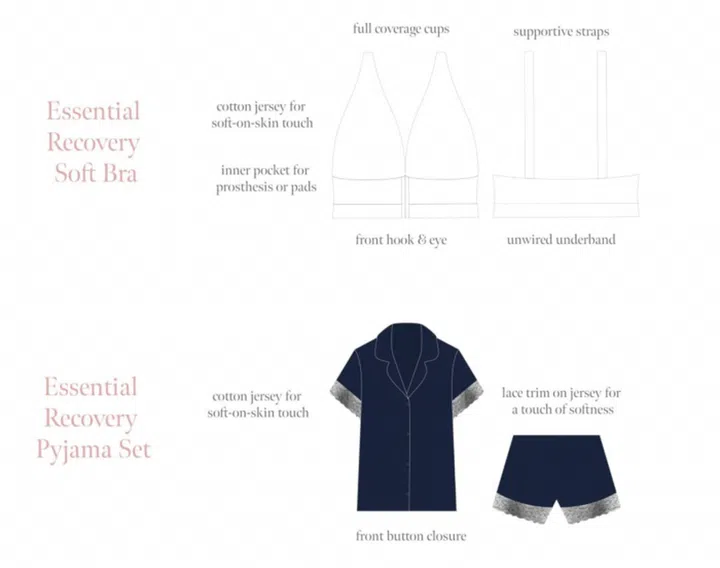 Imbued with the signature Perk by Kate aesthetic, the six-piece collection was created to support women through their recovery process following a mastectomy or breast reconstruction surgery, It features five different bras with elements that support any post-surgery recovery, as well as a pyjama set.