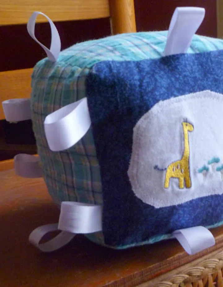Who knew that six square patches, a couple of ribbon loops and some stuffing could turn old baby onesies into a fun ribbon block to keep your infant entertained! Try playing with different coloured ribbons as well, so you can make it more exciting for your baby.