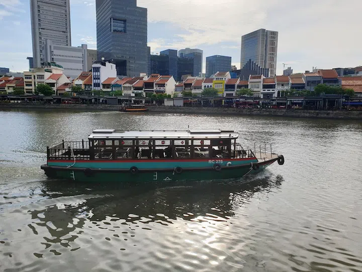 Farther down the river, the pale and beautiful River House stands out among the loud colours of Clarke Quay.