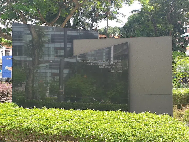 The Memorial to the Victims of Konfrontasi on Dhoby Ghaut Green faces MacDonald House, where, in 1965, a bomb planted by Indonesian saboteurs killed three and injured 33. The attack marked the darkest day of Konfrontasi, or Confrontation, the period in the 1960s when Indonesia waged an undeclared war against the creation of Malaysia. Singapore was briefly part of the new nation.