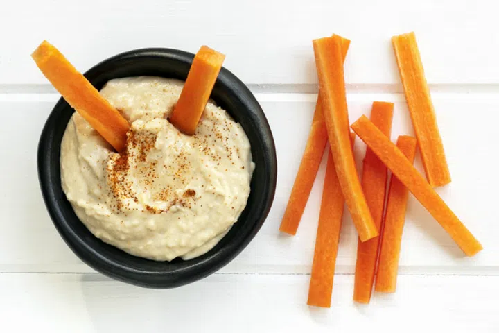Examples of healthier, nutrient-dense snacks are yogurt with fruits, cheese and whole-grain crackers and vegetable sticks with small amounts of dips such as peanut butter or hummus (made from chickpeas). Such snacks are good alternatives to potato chips or cookies, and can satisfy hunger pangs and prevent a child from overeating at the next meal.