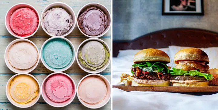 The Guilty Pleasures package gets you a choice of savoury or sweet treats — 4 mini ice creams (Tahitian Vanilla, 66% Dark Chocolate, Strawberry Cheesecake, Mango Sorbet) or a tub of wings and curly fries from the hotel's 25 Degrees Burger & Liquor Bar — together with a night's stay in the Good Room with a queen bed.