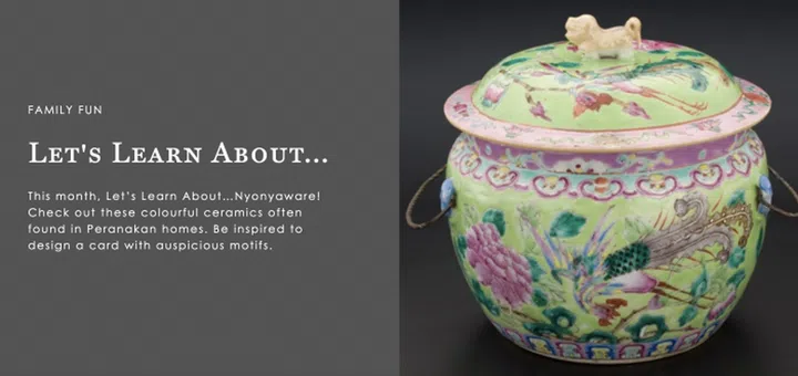 Want to learn about Peranakan culture without leaving your home? This month, the Asian Civilisation's Museum 'Let's Learn About...' website page is full of information about Peranakans and the wares in the collection. You and your kids can take a look at a plate, a kamcheng (covered jars), and a spoon that the museum has. Read more about each item's history, when it was found, and the symbolism of the everyday items under each picture.
