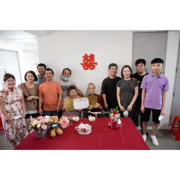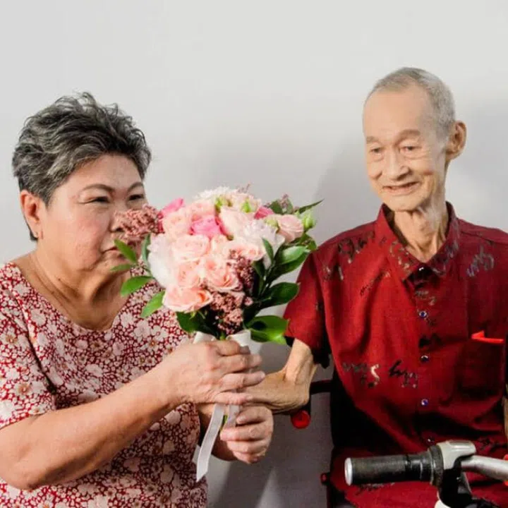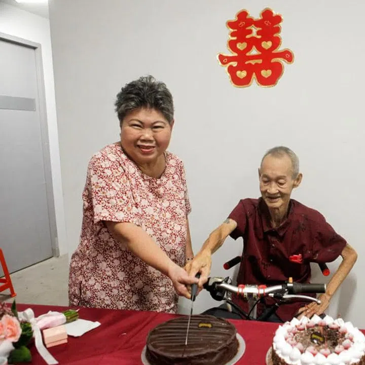 With the blessing of Wu's children and the help of volunteers from Ambulance Wish Singapore as well as sponsors who provided floral and makeup services as well as wedding favours, the couple held a simple ceremony outside their HDB flat.