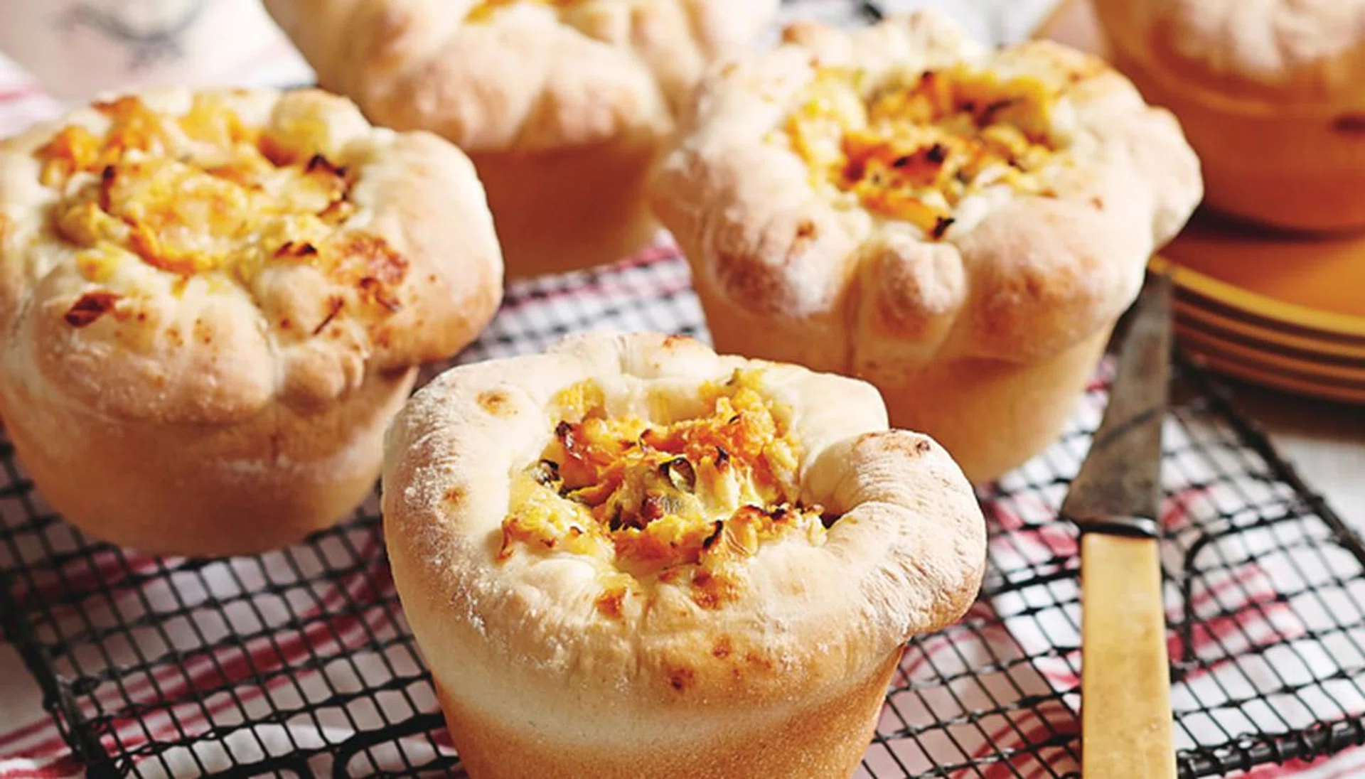 Fluffy bread dough pies that encase a pumpkin, chicken, cheese and creamed corn centre. A mixture of sweet and savoury to be enjoyed on any occasion.