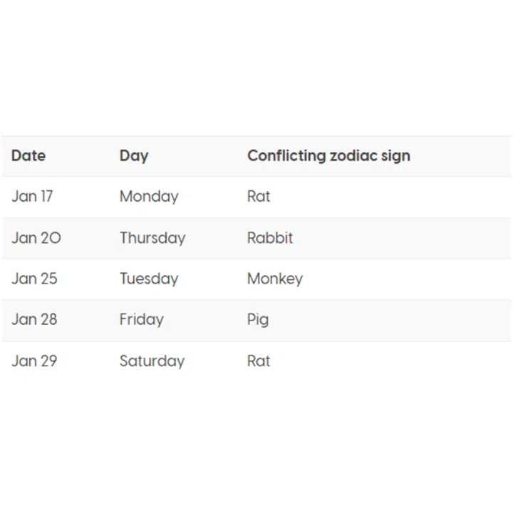 Similar to the auspicious dates for ceasing and starting work, try to choose a date that doesn't conflict with you and your family member's signs.