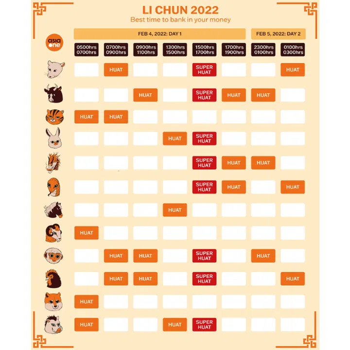 Apart from Li Chun, which is regarded as the luckiest day to deposit your money, read on to find out the optimal times for you to discontinue work, start work, spring clean and visit your loved ones.