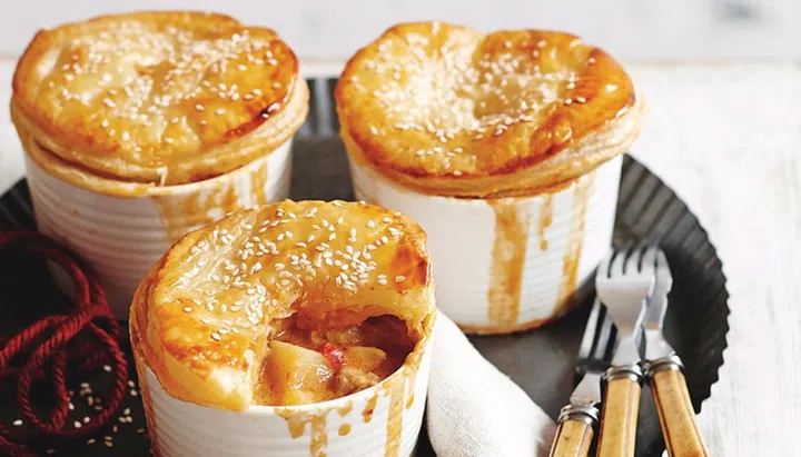 A puffed and golden chicken pot pie made of flaky, baked puff pastry and a Thai red curry and coconut chicken and potato filling.