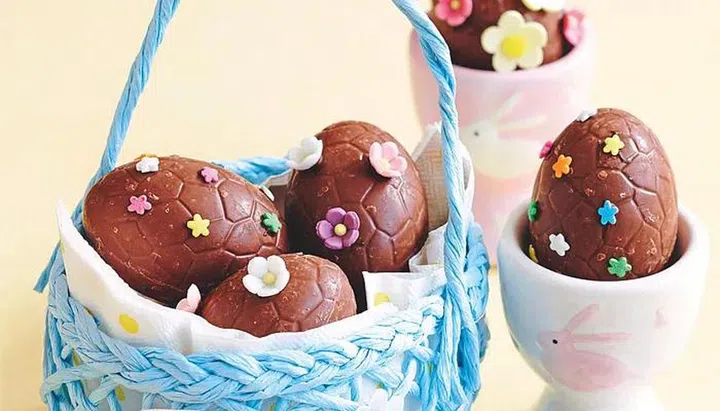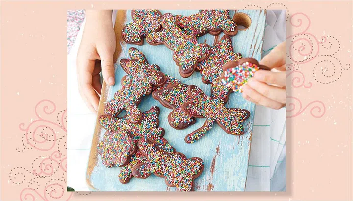 The kids will love helping out with these cute treats this Easter. Just bake the biscuits, smother in melted chocolate then sprinkle with hundreds and thousands.